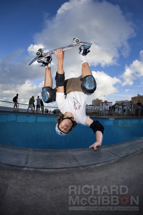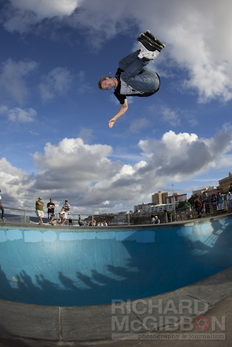 Had a great weekend over Easter. Spent my Saturday at the Five Dock jam. It was a great day with some very impressive riding, huge airs and a great atmosphere. On the Easter Sunday and Monday I spent my afternoons down at the Bondi bowl shooting skating. I had never really spent any time there before as it’s a reasonable length of trip to get there from here and I figured the scene there was as weak as it is here. Sunday afternoons down there are great though and the scene is very much alive and kicking. The bowl is a great shape and size and the park is not over-run by kids on scooters. As you can see in the shots below the spectacle attracts quite a crowd who all gather round to watch. I am looking forward to heading back down there this coming Sunday and shooting a heap more shots.