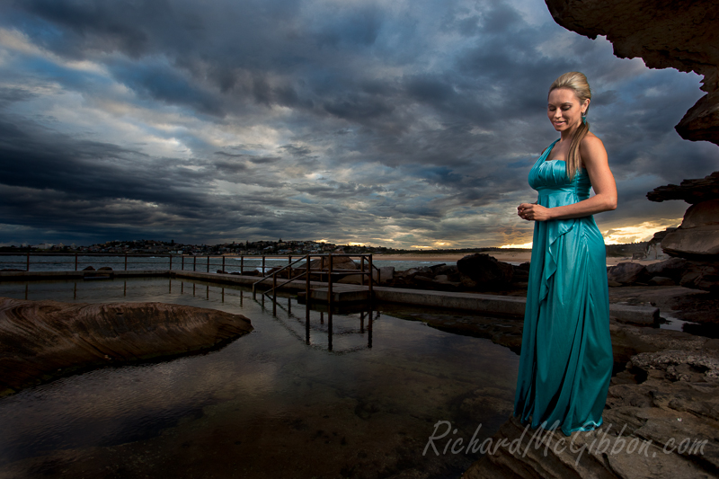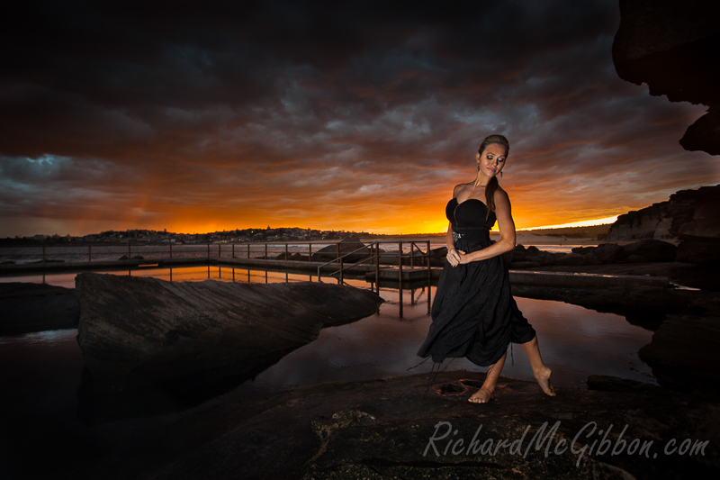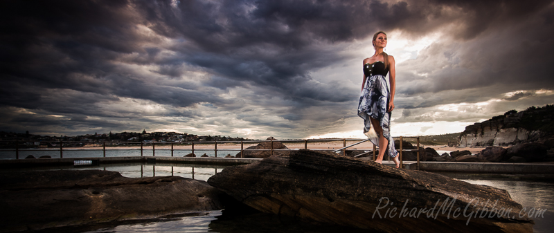 Last week I had the pleasure of shooting with the lovely Kate McCracken, a model here in Australia. The goal of the shoot was to make some shots where instead of her being the model being the main focus of the photo she would be an equal part of it along with the landscape. We weren’t sure until the last minute if the shoot would go ahead due to the weather, the heavens were threatening to rain down upon us the whole time. We took the risk and went to one of my favourite beach pool, North Curl Curl rock pool hoping to get at least a glimpse of a colourful sunset.